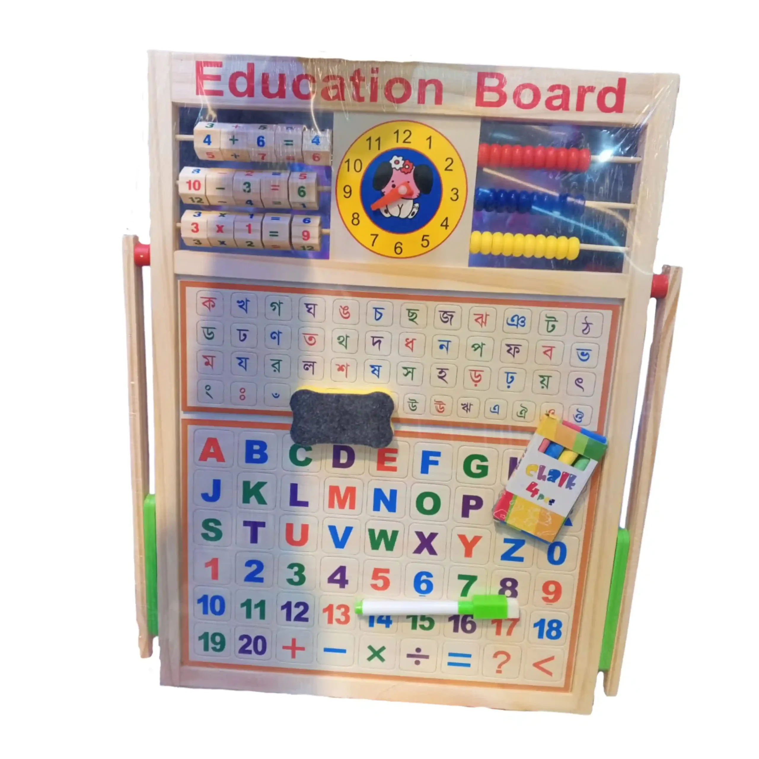 এই মাল্টিফাংশনাল কাঠের এডুকেশন বোর্ডটি শিশুদের জন্য একটি আদর্শ শিক্ষামূলক খেলনা। এতে রয়েছে একটি অ্যাবাকাস (গণনার জন্য), ঘড়ি (সময় শেখার জন্য), এবং বাংলা ও ইংরেজি বর্ণমালা ও সংখ্যা লেখা শেখার বোর্ড। এটি শিশুদের বর্ণজ্ঞান, সংখ্যাজ্ঞান এবং হাতে-কলমে শেখার ক্ষমতা বাড়াতে সাহায্য করে।