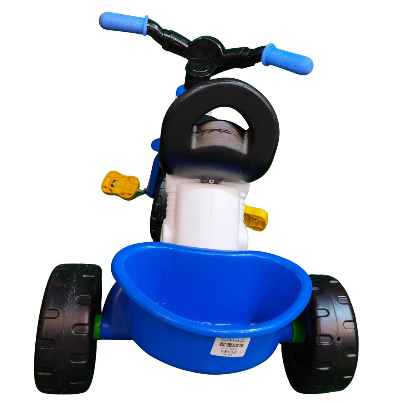 • ডিজাইন: নীল-সাদা ফ্রেম, কালো চাকা, হলুদ প্যাডেল এবং নীল হ্যান্ডল।